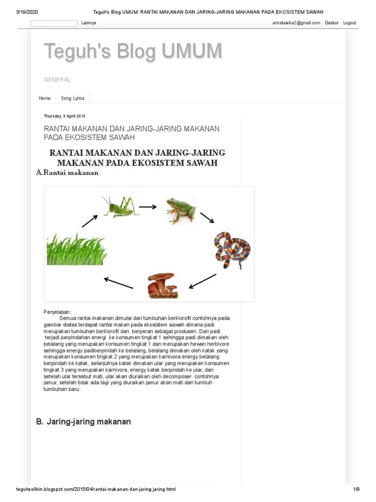 Rantai makanan memiliki peran pentin dalam berjalannya sebuah ekosistem. Rantai makanan tema 5 kelas 5 sd ekosistem sawah youtube. Rantai makanan perumput atau sawah, juga bisa disebut sebagai rantai makanan ekosistem darat. Pembahasan mengenai ekosistem sawah lengkap dengan rangkuman pengertian, ciri ciri, komponen dan rantai makanan dari sawah. Padi → tikus → ular sawah → elang → dekomposer/ pengurai.
